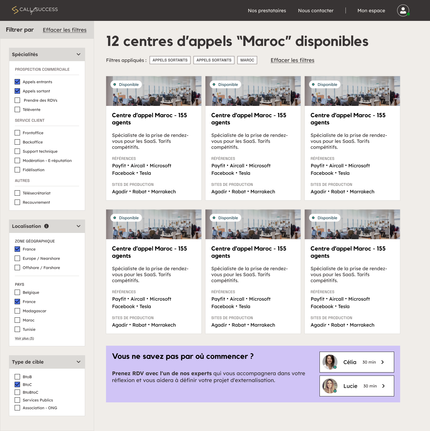 Call of Success est une marketplace BtoB, permettant de mettre en relation des projets d'externalisation avec des centres d'appels dans le monde entier.